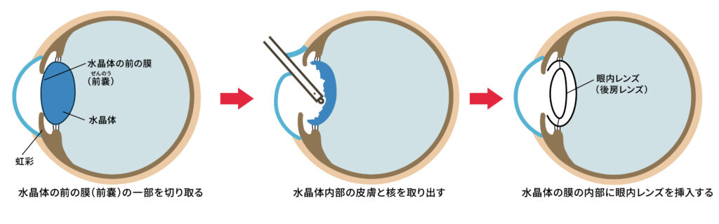 白内障の手術は、超音波装置を用いて小さな傷から濁った水晶体の中身を細かく砕いて吸い出し、人工の眼内レンズを入れる治療です。