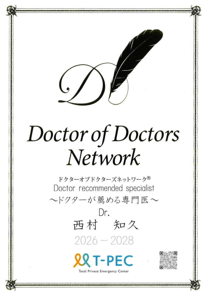 西村 知久 理事長が「Doctor Of Doctors Network 〜ドクターが薦める専門医〜 2026-2028」に認定されました。